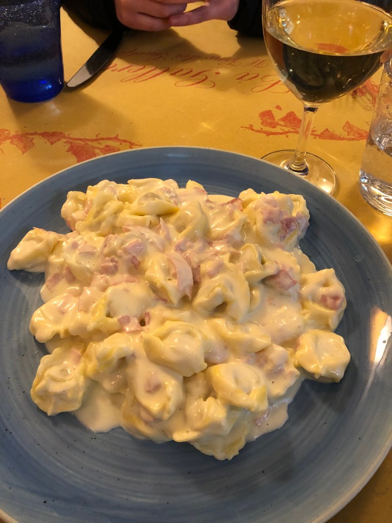 Tortellini is a very popular pasta, especially in Bologna. This amazing tortellini alla carbonara is from Ristorante La Galleria Il Vino dei Guelfi cucina tipica fiorentina. Located on the less touristy side of the Ponte Vecchio in Florence, this restaurant has a wide variety of meal options. They even offer gluten free versions of some pizzas and pastas!